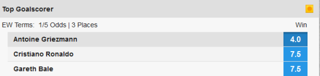 Antoine Griezmann je najveći favorit kladionica u ovom trenutku. Njegova reprezentacija igra protiv Islanda u četvrtfinalu, dok je on u osmini finala briljirao i postigao dva gola, gdje je odveo Francusku u daljnju fazu natjecanja. Griezmann je trenutno u top formi, odigrao je 255 minuta, što je 98 minuta manje od njegovog rivala Gareth Balea, a već je postigao tri gola. Nije zabilježio nijednu asistenciju. Kladionice Bet365 i Betfair mu daju najveće šanse, a koeoficijent je 4.00.
