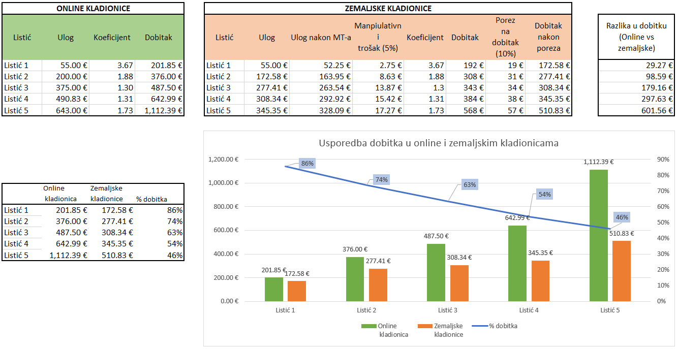 Koliko god se nekome tih par % MT-a i poreza na dobitak činilo malo, iste smanjuju i ulog i dobitak za svaki sljedeći listić pa evo i kako to izgleda.
