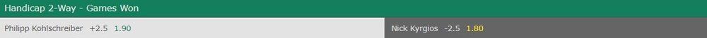 Kohlschreiber - Kyrgios // +2,5 Kohlschreiber bet365 - 1,90
