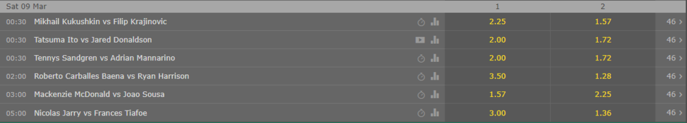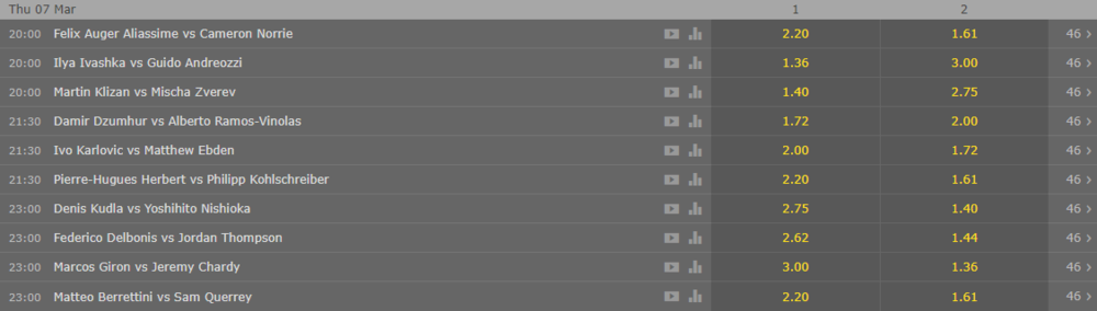 Dakle, ne računajući zemljane Masterse, Indian Wells je zapravo turnir sa najsporijom podlogom, a razlika u odnosu na Shanghai, Paris i finalni masters je ogromna. S obzirom na to, mislim da će Karlovićev servis u dobroj mjeri biti neutralisan, a na posljednja tri nastupa na Indian Wellsu eliminisan je u prvom meču, što govori da mu definitivno ne leži ta podloga. Naravno, nije isključeno i da pored svega, obojicu krene servis te da čitav meč prođe u "bombardovanju" sa obe strane, ali i u slučaju da Karlović eventualno dobije meč u tri seta, a da sva tri završe u tiebreaku (što se često znalo dešavati u njegovim mečevima), opklada je opet dobitna.