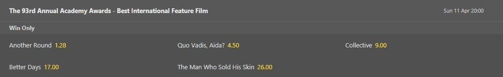 Izvor: https://www.svijetkladjenja.com/dugorocne-oklade/gdje-se-kladiti-na-oscare-2021-i-tko-su-najveci-favoriti-u-pandemijskoj-godini/