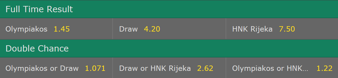 Svakako, Rijeku očekuje težak dvomeč protiv Grka koji imaju ulogu favorita što govore i tečajevi u najvećoj svjetskoj online kladionici, bet365 koji nudi tečaj 1.45 u prvoj utakmici koja se igra na Karaiskakisu. Tečaj na pobjedu Rijeke je 7.50. Naravno, ukoliko Rijeka pruži dobre partije u obje utakmice, grčki tim će lako položiti oružje, jer objektivno gledano, Olympiakos nema kvalitet koji je imao prethodnih sezona kada su bili aktivni učesnici Lige prvaka.
