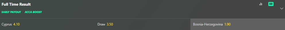 Uzevši u obzir bolju formu, kvalitetu i međusobni omjer, očekuje se da BiH nastavi pobjednički niz i potvrdi prvu poziciju u skupini. Kvota na pobjedu gostiju iznosi 1.90, a s obzirom na ofenzivnu moć obje ekipe, vrlo je izgledno da ćemo gledati utakmicu s više od 2.5 gola – ukupna kvota 3.70.