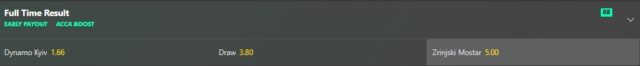 Uoči susreta, kladioničarski izgledi nagovještavaju mogućnost iznenađenja. Kvota 5.25 u bet365 kladionici na pobjedu Zrinjskog izgleda vrlo primamljivo, s obzirom na formu Mostaraca i nestabilnost Dynamo Kijeva u europskim ogledima. Organiziranost i samopouzdanje Zrinjskog mogli bi im pomoći da iskoriste greške domaće obrane i upišu vrijedan trijumf.
