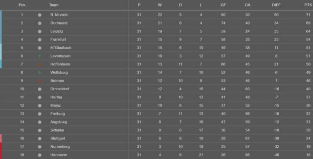 Ekipa Dortmunda jednostavno više nema pravo na kiks, te su se doveli u situaciju kada više ne odlučuju sami o svojoj sudbini iako su većinu prvenstva proveli na liderskoj poziciji. Moraju slaviti u svim preostalim mečevima i nadati se da će Bayern ponovo prosuti bodove.