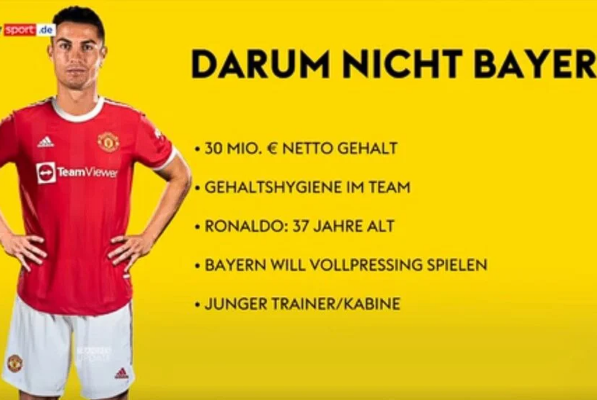 Prvobitno, Ronaldo u Manchester Unitedu zarađuje 30 milijuna eura godišnje, a s takvim prihodima srušio bi Bayernovu strukturu plaća ili, kako je Nijemci vole zvati, “higijena timskih plaća”, što je također još jedan razlog.